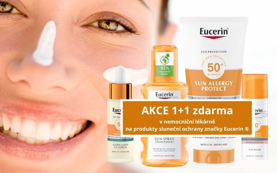 Pokud chcete doplnit zásoby kvalitní sluneční ochrany, v naší nemocniční lékárně právě probíhá akce 1+1 zdarma na produkty Eucerin Sun. Platí do konce dubna 2026 nebo do vyprodání zásob. Zeptejte se tedy našich lékárníků, rádi vám poradí a pomohou s výběrem správného produktu.